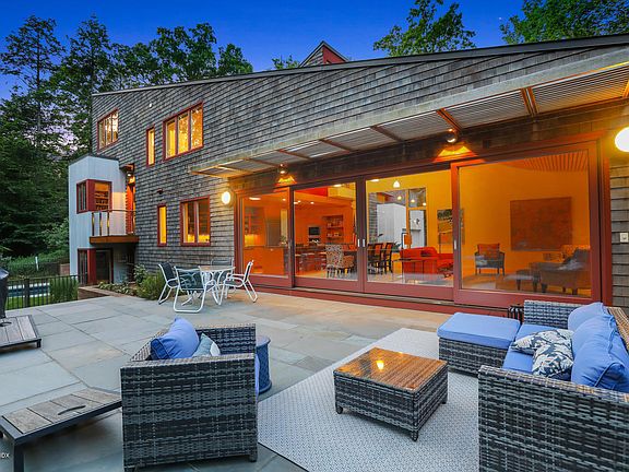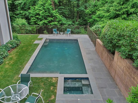 Custom built in 2008, this modern home blends the light and space of an open floor plan and soaring ceilings with the warmth of bamboo flooring, a double height undulated wood ceiling and a hand laid stone fireplace. The result is a serene 4 acre retreat abutting 20 acres of Audubon property and the East branch of the Byram River. Step through massive sliding doors from the Great Room onto a large deck. Enjoy the heated in ground pool. Walk down to the river where the original house floor and fireplace serve today as a charming waterside retreat. The 1st floor master suite is one of 4 ensuite bedrooms plus a home office, a playroom/media room, 2nd floor sitting area overlooking the Great Room, walk in pantry, separate laundry room, mudroom, 2 car garage, generator, audio system and more