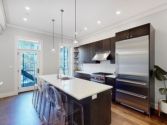 Modern meets sophistication in this unique South End brownstone. Beautifully designed & all brand new in 2016, this triplex boasts over 2200 sf of living space with no details spared. Enter on the upper floor to a spacious, open layout with living room, dining area, and chefs kitchen featuring state of the art appliances, custom cabinets, large island, solid stone countertops & separate breakfast nook, 1/2 bath & a walk-out rear deck that leads directly to 1 parking spot. Over-sized windows flood the unit with sunlight showing off the high ceilings & recessed LEDs. The middle floor consists of the master suite with double sink, marble tiled walk-in shower, & guest room with its own full bath. The lower level boasts a media room for movie viewing & 3rd bedroom or office with 3rd en-suite full bath & large closets and storage. Direct access to the private patio with gas line and with plenty of room for private entertaining. Multi-zone Central AC/ heat, tankless hot water and NEST System