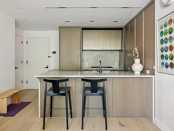 The interiors feature 7” white oak floors, double-glazed casement windows, solid core doors, and central air with efficient, whisper-quiet heat pumps. The custom kitchen combines Luca de Luna quartzite counters with white oak cabinetry and Thermador appliances. The serene primary suite includes a spacious walk-in closet and a beautiful bathroom with a double sink vanity and pleated marble shower. The secondary bedroom offers a large closet and a full bathroom conveniently located in the hallway.