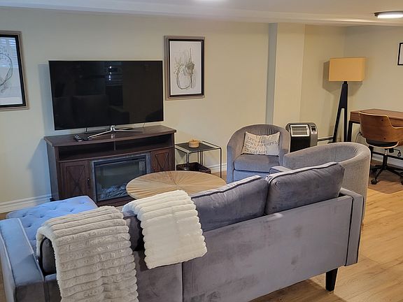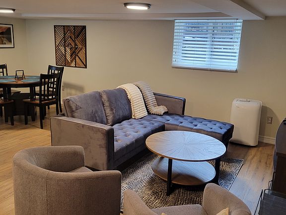 A cozy and stylish newly renovated, fully furnished, large one-bedroom lower-level apartment (800 sf) in the desirable Swansea/High Park area? Our completely renovated and fully furnished one-bedroom lower-level apartment has everything you need for comfortable urban living. Located in one of Toronto's most desirable neighbourhoods, our apartment is just a short walk away from the stunning High Park, trendy Bloor West Village, and the beautiful Lake Ontario waterfront. With easy access to public transportation (Jane subway station), shops, restaurants, and entertainment, you'll have everything you need right at your fingertips. The apartment features a modern and tasteful design, with high-end flooring everywhere, a fully equipped kitchen, sleek finishes, and plenty of natural light. The kitchen is fully equipped with stainless steel appliances, including a dishwasher, flattop range, microwave, fridge with freezer and coffee maker, as well as all the cookware and utensils you need to whip up a delicious meal. The granite countertop gives an extra nice look. The living room is spacious and comfortable, with a plush sectional, 55in flat-screen TV and an electric fireplace, perfect for relaxing after a long day. The area of the living room is designed as a separate working space and it is equipped with a new working desk and a chair. Beautifully decorated separate master bedroom boasts a comfortable double size bed with individual coil comfy mattress with soft linens and ample closet space. The dining room table and four chairs in the nice finish can be extended for extra space for dinner with friends or family. Amazingly designed full bathroom with shower cabin (stone floor). The apartment also includes a separate private entrance and full-size in-unit laundry for your exclusive use. Parking on the street in front of the house. Only a portion of utilities (40%) is paid on top of the rent. No smoking, please!