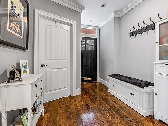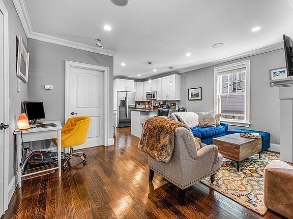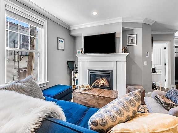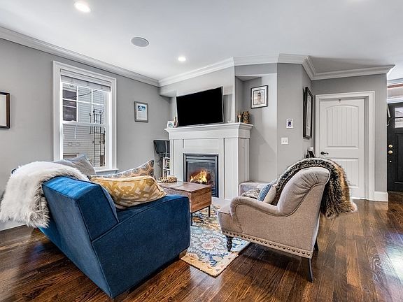 Located on a quaint one way street, this beautiful 2 bedroom, 2 bath condo has so much to offer! Enter into the open concept living space with hardwood floors and gas fireplace. Off of the living space is a modern kitchen equipped with white shaker cabinets, granite countertops and Bosch stainless steel appliances. The primary bedroom, located in front of the home, is large and bright with an ensuite bathroom. The second bedroom is sizable with ample closet space. The back door of the unit leads to a small private deck. Other features include recessed lighting, in-unit laundry, central air, and additional private storage in the basement.