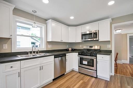 Featured on a large flat lot, an awesome starter home that gives you lots of playing field! Off the back, an adorable three season porch (possible mud room) that offers a large closet to tuck away coats and shoes for an added score! The bright kitchen highlights newer cabinets, counters, flooring, recessed lights & SS appliances, ALL 2019. First floor bath has been updated with a shower stall making it a win. Keeping some old charm with bright tin ceilings in the dining room that shines with refinished wood floors. An open layout to the living room makes it cozy with newer (2019) carpeting. The second floor offer the master bedroom with beautiful hardwood floors. A cute 2nd bedroom with newer (2019) carpeting leads you to a tandem 3rd bedroom that features a larger closet as a bonus. 2nd floor also offer a second bath. Freshly painted throughout, making it a HOME run! Electric panel/ service and a 1 car detached garage adding to the WIN!!