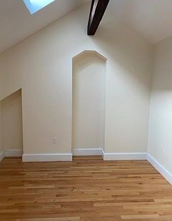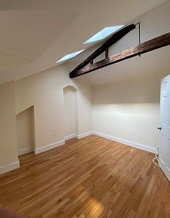 Penthouse one bedroom condominium flooded with light located in charming Greek revival townhouse. Livingroom with lofted ceiling and skylights, wood floors throughout. Modern kitchen with d/d, and electric range. Spacious and architecturally interesting bedroom with great closet/storage space and skylight. Modern tile bathroom with skylight. Clean lines and sunny space. Avail 6/1 possibly before. No pets.
