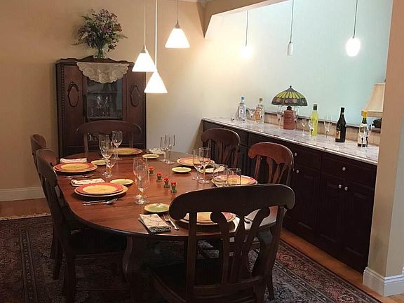 Back by Popular demand-The Hills! Boasts a first floor bedroom hardwood flooring on first level. updated kitchen with ceramic tile flooring. Huge dining room with built in serving buffet so convenient. Amazing crown molding. Very private deck with sun setter awning. Brand new high efficiency Pella Windows through out. Upstairs has very functional loft space with skylights, loft space is so functional with plenty of work space and storage. Guest bedroom & full bath. Lower level so nicely finished with beautifully tiled 1/2 bath a sliders to patio. Plenty of storage ceramic tiling, gas burning woodstove to cozy up to. Workshop & handy utility room. Plenty of storage.