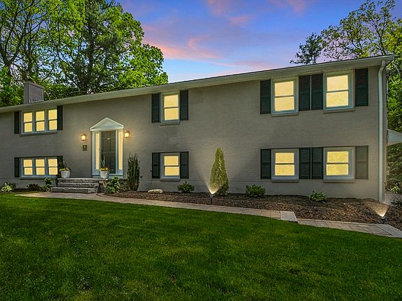 Luxury retreat! 4 bed, 3 bath home on 1+ acre. Modern elegance inside, stunning outdoor oasis. Landscaped front yard, custom walkway. Custom millwork, open plan, skylights, hardwood floors. Chef's kitchen: cherry cabinets, granite, island (seats 4-5), SS appliances. Dining to fireplace living room & sunroom. Deck w/ hot tub, landscaped paths. Scenic views, private oasis. Primary suite w/ vaulted bath. 3 more beds, full bath on main. Downstairs: fireplace family room (bamboo), bath, gym/office, laundry, utility (cedar closet). Ample storage. Stone paths to perennial garden. Year-round yard, seating areas. Fenced entry to resort-style paradise: pergola, patio, fire pit, fiberglass pool (wedding cake stairs). Luxe pool house: granite wet bar, beamed ceiling, dining for 8, lounge. Private outdoor shower. Move-in ready! Schedule your viewing!