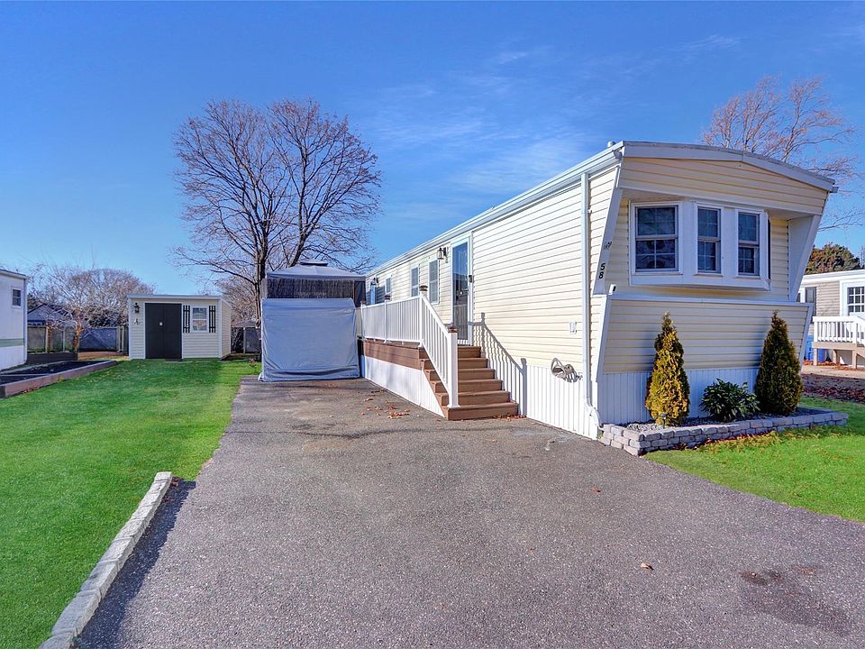 Welcome to Bunker Valley Hill Mobile Home Community! This freshly painted, diamond 2-bedroom, 1-bath home is ideally situated within the community and features central air, real hardwood floors, and oil heat. With numerous updates-including siding, windows, an upgraded electric panel, and a modernized bathroom with a stackable washer and dryer-this home is ready for you to move right in! Enjoy a spacious deck with a charming fish pond, two large sheds, and a beautifully landscaped backyard. Located in the desirable Connetquot School District, the home also boasts stainless steel appliances in an updated, wraparound kitchen. Additional amenities include a driveway for 2-car parking and extra storage space in the crawl space. All residents must complete the community's residency application. The monthly land lease fee of $1,251.86 covers water, taxes, sewer, snow removal, and garbage service. Appearance: Diamond