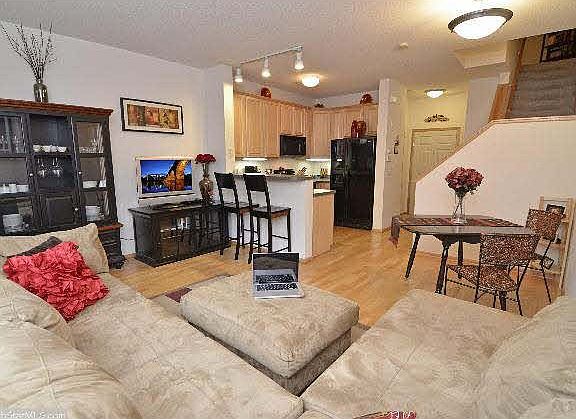 Main floor 2 level 1 bedroom home at Riverstation with outdoor access to common area! Home has wood floors throughout main level. Move in ready w/ many updates! 2 parking stalls and storage locker included!