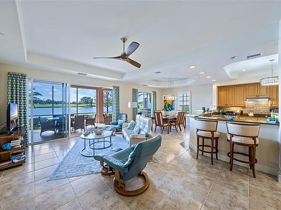 C7494 Prepare to be WOWed! The photos simply don't do justice to the panoramic and private picture postcard views of golf course and several lakes with wading birds and fountains, from the living areas, kitchen and 300 SF tiled lanai! Sought-after Southern exposure! Built in 2007 to current codes, all windows/doors are impact glass, plus electric shutters surrounding the lanai protect your lanai furnishings from the elements year-round. This condo has been highly upgraded including all tile flooring (beautiful wood-look tile flooring added in the primary and one guest bedroom), classic plantation shutters on all windows; coordinating glass tile backsplash, GE stainless appliances, and granite counters; and newer upgraded lighting/fans. The AC was replaced in 11-20; the water heater in 1-20. Pride of ownership is apparent in the high-end turnkey furnishings with a coastal flair. Spa-like primary bath with HUGE closet. The Avellino amenities are an easy stroll and the best of any neighborhood in the Vineyards, including junior Olympic pool/spa, state-of-the-art fitness center, chickee hut with grills, and redecorated clubhouse where you'll enjoy meeting neighbors. Private driveway!