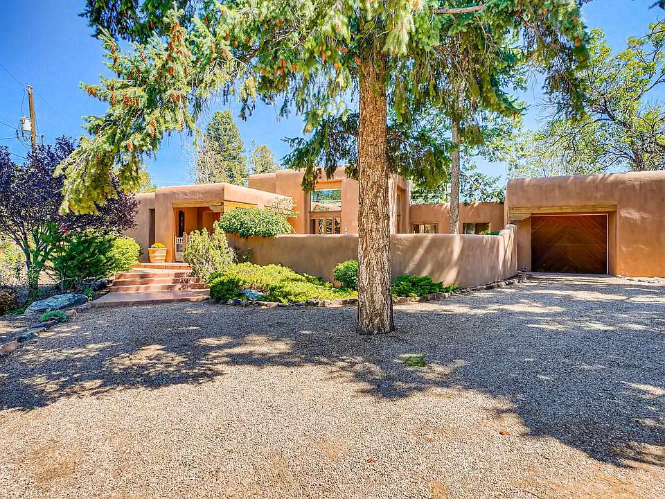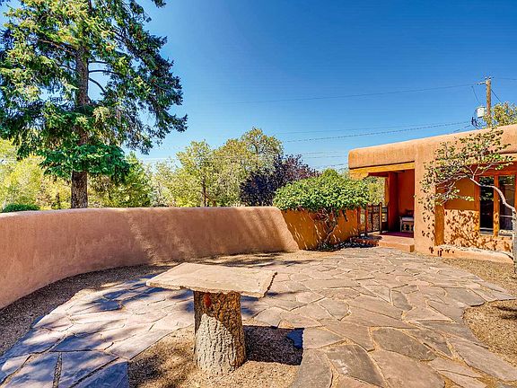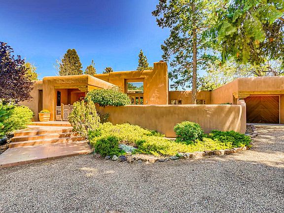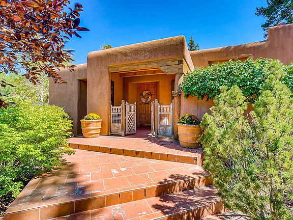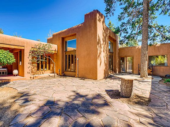 This beautiful eastside home sits on a corner lot of Old Santa Fe Trail and East Coronado - Close to the plaza, Kaunes neighborhood market, Canyon Road, Museum Hill, galleries, restaurants, Wood Gormley Elementary, and more. This exquisite gem features high ceilings in the living room, a wood burning fireplace and large windows that let the beautiful natural light in. Saltillo tile flooring flows throughout the home - living room, kitchen, dining, bathrooms and laundry room. Carpet in bedrooms. Handsome Vigas and beamed ceilings flow throughout most of the home. The master bedroom is separate of the guest bedroom. A bonus room/office/den (possible 3rd bedroom) is near the master suite. Enchanting custom doors open to the master and office. French doors in master bedroom, office, dining room, and the sliding door in the kitchen - make indoor/outdoor living its best during the warm summer months - all leading to their own patio space in the large backyard. Entertain anytime of the year inside or out! The hallway off of the kitchen, laundry room, pantry, and 1 car garage has its own sliding door that opens to the private front flagstone courtyard. This wonderful home sits on a just over a quarter acre (0.295168) with a gorgeous adobe wall with coyote trim fencing that brings privacy to this beautiful setting. Schedule your private showing today!