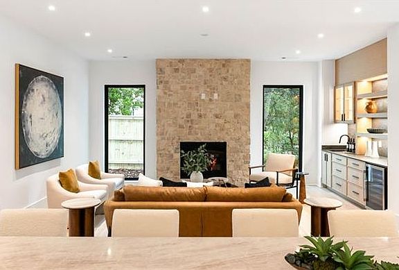 Fireplace accent wallWaterfall islandDesigner decorative lightingLight neutral palettePrivate rear parkingBlack-metal finishesLed backlit vanity mirrors