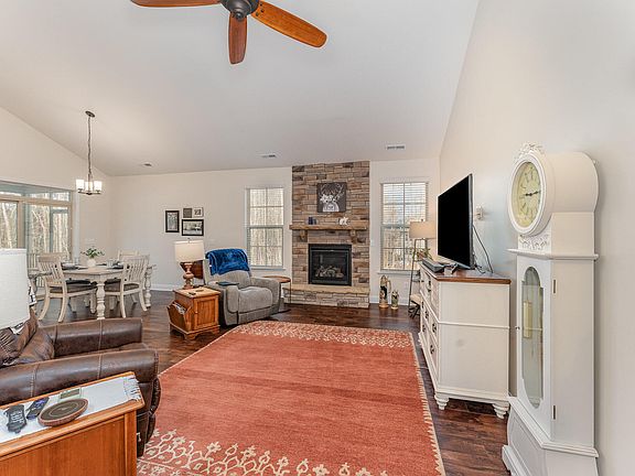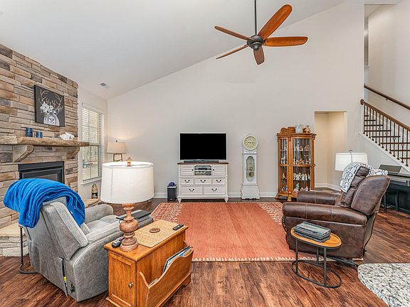 Move in ready 3 BR home with 2 BR/2BA on main floor! 1 BR/BA up with large bonus room. Beautiful ranch-style home with vaulted ceilings in living/kitchen area. Large kitchen, breakfast room and family room combine to make spacious gathering space for friends and family. Stone to ceiling fireplace highlights the open floor concept. An additional open office/dining room on the main floor. Screened porch off the breakfast room over looks tree lined lot and separate brick patio area provides an additional outdoor gathering spot. Upstairs BR is separate from the full bath room and large bonus room providing privacy from the main floor. Situated on .37 ac you're just a short walk to #9 tee box of Olde Liberty Golf Course. Storage area can be found in the attic as well as the installed shelving units in the garage.