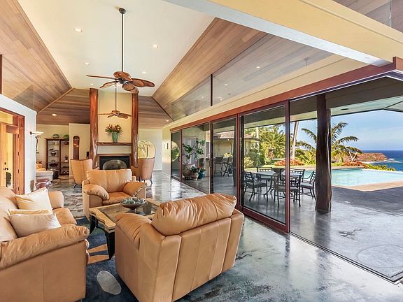 This beautiful ocean front Home and Cottage on the coastline of Maui’s north shore are truly a sight to behold. The breathtaking ocean views from this 3 bedroom, 3.5 bath home and 1 bedroom, 1 bath cottage are absolutely stunning and will leave any viewer in awe. Designed and built by Maui’s renowned John Cahill. The open floor plan is perfect for island luxurious living, as it provides a spacious and airy atmosphere that perfectly complements the surrounding natural beauty. Exquisite 'Ohi'a and Bamboo woodwork throughout the entire property, add a touch of island beauty to the interior design. Other features include polished concrete floors, granite countertops, vaulted ceilings and seamless indoor/outdoor living. With spectacular ocean views from every room, this house is truly a dream come true for anyone who loves to be surrounded by the beauty of nature. The home is surrounded by mature citrus trees, providing not only a beautiful and peaceful ambiance, but also an abundance of fresh fruit. With 2 usable acres and an additional 5 acres zoned for conservation, the total 7 acres of this property offer a private and serene environment ideal for those seeking a peaceful retreat.