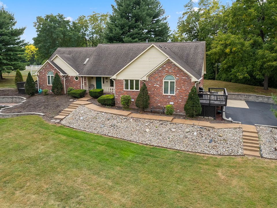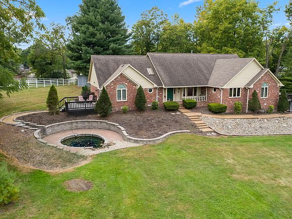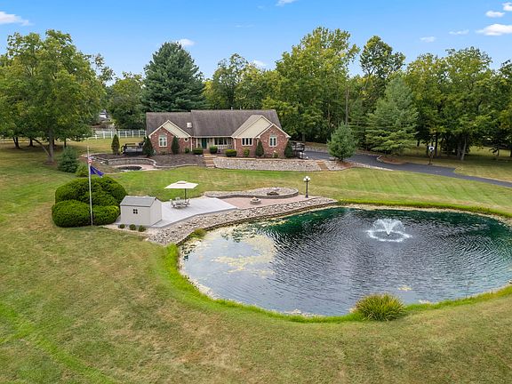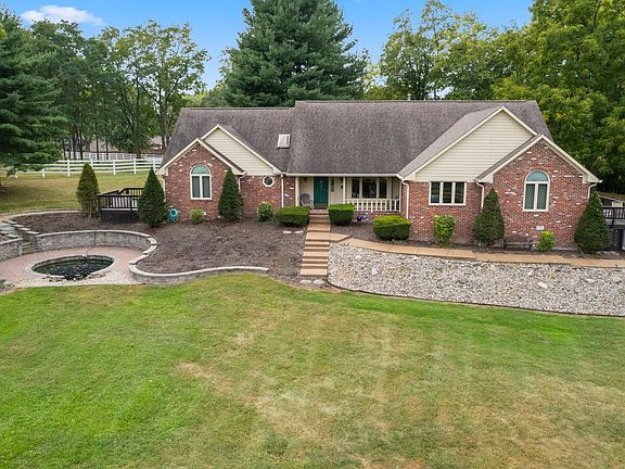 Welcome to this exceptional custom-built home nestled in Center Grove, boasting nearly 3,000 square feet of living space on nearly 5 picturesque acres. The property features two ponds and a rippling creek, creating a serene and scenic environment. Inside, you'll discover a delightful floor plan with 4 bedrooms and 4 full baths. The great room showcases a vaulted oak ceiling, a stunning brick fireplace, and a grand built-in bookcase. The Owner's Suite, located on the main level, includes a walk-in closet, access to a private deck overlooking one of the ponds, and a full bath with double sinks, a skylight, a whirlpool tub, and a shower. The spacious kitchen is equipped with updated appliances and an eat-in dining area with a lovely view of the larger pond and front yard. The upper level, currently used as a fourth bedroom, is adaptable for various purposes. This space offers a full bath, a walk-in closet, and convenient walk-in access to a floored attic. Additionally, this home features a designated office with double doors, a vaulted ceiling, and a second private deck offering wonderful views of the property. The oversized garage provides ample storage and includes a workbench area. Outside, the expansive grounds boast mature trees and abundant wildlife, creating a haven for nature enthusiasts with squirrels, birds, and fish. Conveniently located near shopping, restaurants, and schools, this tranquil property embodies the essence of a forever home, offering a cherished lifestyle for years to come.