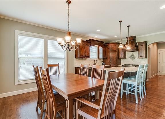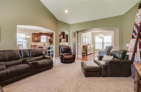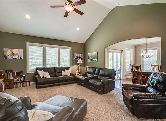 Beautiful Reverse 1.5 home is located on a cul-de-sac and less than 2 miles from Olathe schools! Side facing, oversized 3 car garage provides added curb appeal and excellent driveway space. Open floor plan on main level features hardwood floors in the dining, kitchen, entry and hallways, and carpet in the large vaulted great room. Gourmet kitchen is equipped with stainless steel appliances, walk in pantry, kitchen island, granite countertops and a brand new dishwasher. Primary suite has a luxury bathroom and deep walk in closet. Walk-up finished LL has tiled dining area with gorgeous wet bar, recreational space, living room, bedroom and full bath. Outdoor lounging, entertaining and grilling can be enjoyed from the comfort of the maintenance free composite sundeck or from the stamped concrete patio! Roof and gutters fully replaced in 2019. In-ground sprinkler system covers all yard and landscaped areas.
