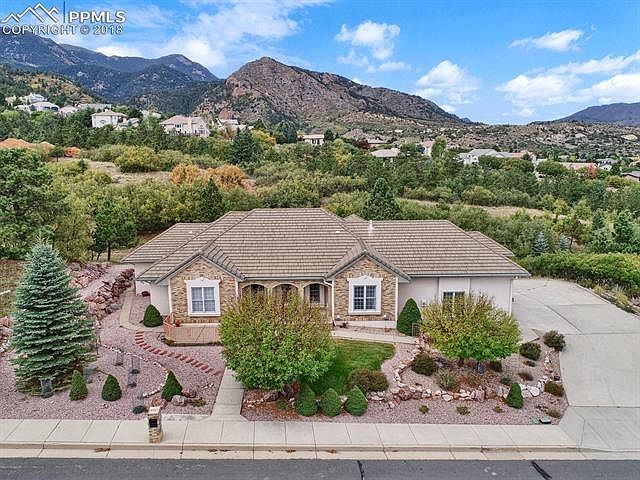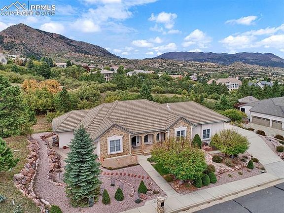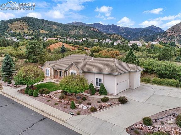 Beautiful custom home in Top of Skyway. Boasts 360 degree views of downtown Colorado Springs, Garden of the Gods, and front range. Nestled at the top of a quiet, no-outlet street, this home backs to open space and has ample amounts of privacy. This custom Oxford home is set apart and offers all the extras. Great room with vaulted ceilings, kitchen with Corian counters, white washed oak cupboards with black walnut trim. Large Trex composite deck with gas connection for grilling on deck, as well as downstairs walkout patio. The expansive Great room on main level flows with natural sunlight and offers spectacular views from large, elevated windows. Cozy up to the white marble gas fireplace. The master bedroom is secluded with views of the mountains and city. Master bath with his/her vanities, jetted tub and large walk-in closet. The main level, basement and garage each have their own thermostat, offering both heating and A/C, giving a desirable environment regardless of the season. The garage also offers a phone connection, work station, and RV oversized parking space and was designed for elevator installation for future use. Vertical blinds have been installed on each window of the home. Roof has highly durable Tile shingles. Each side of the home has water spigots for convenient access. Gold-plated appliances in shared upstairs bathroom. Every room of the home has cable connection for TV availability and entertainment. Basement has large wet bar, kitchenette, with additional washer and dryer connection, along with two water heaters for ability to host family and friends comfortably.