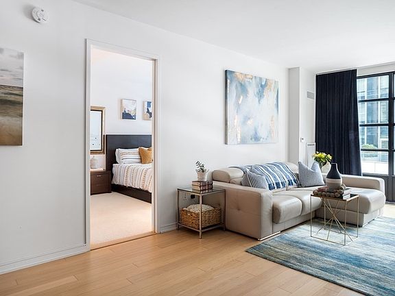 One of the best one-bedroom layouts offering at Millennium Place! The unit has an additional half bathroom and an en-suite marble-appointed master bathroom. This home includes 835 square feet of living space, offering a spacious living room plus a bedroom. The home's open-concept kitchen has solid wood cabinetry, stone countertops, glass tile backsplash, and top-of-the-line appliances. White oak flooring contrasted with floor-to-ceiling windows and finished with black architectural mullions highlight the dynamic view of the 'landmarked' Paramount Theatre. Millennium Place offers 24-hour concierge, doorman & porter services, on-site management & maintenance, and round-the-clock security. Residents can access a private fitness facility, yoga studio, treatment room, screening room, children's playroom, private dining room, resident lounge, and shared outdoor terrace—with direct access to Cafe Nero. Rental parking is available at the garage nearby.