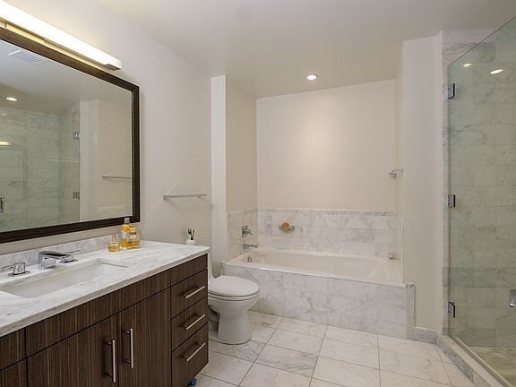 LISTING WILL BE BACK IN THE SPRING!! Reach out for details. 1Bed 1Bath with "wow" factor 10 foot high ceilings. Be part of the discerning residences living in this full service building in the heart of the city. After a warm welcome by the doorman, you will enter a modern, luxurious lobby with a concierge on duty. This unit, located on the eighth floor & gets amazing light throughout the day with its floor to ceiling windows. The open concept kitchen, outfitted with Bosch appliances, marble countertops and custom cabinetry and task lightning, strikes the perfect balance of inclusion with its breakfast bar on the living ar. The soaring windows reach higher than ten feet, giving an amazing sweeping view of the neighboring buildings and the iconic Paramount Theatre. The bedroom is spacious & comfortably carpeted. Custom blinds throughout. The building has a resident lounge as well as private outdoors space, fitness center and theatre.