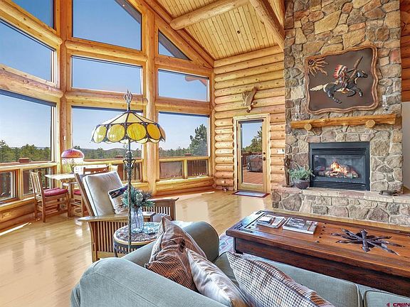This fully furnished, custom crafted log home on over 6 acres has been lovingly and meticulously maintained over the years and is ready for the next set of memories to be created here. Located less than 12 miles from historic downtown Durango and less than 15 minutes from Mercy Regional Hospital, the property provides a retreat in the pines with numerous outdoor spaces to take in the views and peaceful setting. The home offers a quintessential Colorado experience with a vaulted great room, accent lighting to highlight the hand hewn logs and trusses, hardwood flooring, and large fireplace with river rock surround, creating the ultimate place for gatherings. The home is oriented to provide an extraordinary view from both the expansive floor to ceiling windows, equipped with solar shades, or from the generously sized low-maintenance composite deck beyond. The living room is open to the kitchen with granite countertops, Bosch 5 burner range, custom cabinets, raised wood breakfast bar with stone accents, and dining area with bay windows and vaulted ceiling. Also on the main level you will find an office/ guest room hosting bunk beds and a full bed, as well as the primary master suite with vaulted ceilings, walk-in closet, and attached 3/4 bath with direct access to the deck and hot tub. Upstairs you will find a spacious loft area overlooking the great room with views as well as an additional bedroom with en-suite 3/4 bath. The lower level offers not only a generously oversized two car garage, but also a mudroom with utility sink and large workshop. An additional 3rd car garage is accessed from the exterior, the perfect place to store your gear for your outdoor adventures that await you. Or you may opt to just enjoy all the property has to offer and never leave home with the tranquil sounds of the recirculating stream water feature, outdoor pavilion space for entertaining, and campfire ring to take in an evening of stargazing. This home contains a high efficiency propane boiler for the 8-zone in-floor radiant heating system, interior fire sprinkler system, and an outdoor drip irrigation system. This property creates the perfect place for a full-time residence or vacation home getaway. Note: The county assessor and septic both have this property noted as a 2 bedroom home, but the home is advertised as a 3 bedroom for marketing purposes only. There is no closet in the office/ bunk room so it technically is not considered a bedroom by county definitions and the upstairs bedroom is served by an armoire closet. The septic tank size of 1000 gallons is large enough to correspond with 3 bedrooms. The home has been pre-inspected.