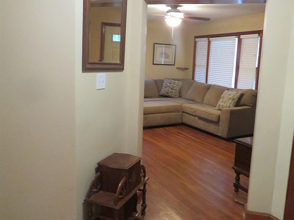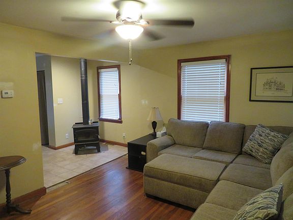 This home features 2 bedrooms, 1 full bath with new flooring in 2022 and a detached garage (24 x 30) with an attached covered carport (12 x 24). The carport could be used as a covered patio for entertaining. There is a large covered front porch and a deck on the back of the house, great for relaxing. Has spacious living room with hardwood floors, ceiling fan and a woodburning stove. The eat-in kitchen has plenty of cabinets for storage, tile flooring, and french door(s) leading out to the deck/backyard. The bedrooms have hardwood floors and ceiling fans. The large gravel driveway provides additional parking. HVAC installed in 2018 per seller. All window treatments are included. House and garage being sold "as is."