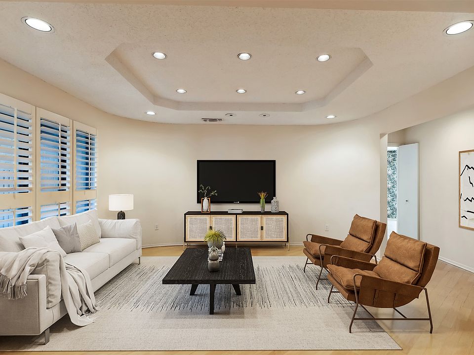 Well maintained soft contemporary with signature design elements. Curved wall accents in dining room, living area fireplace and wet bar. Spectacular ceiling elevation in main living area with lifted windows to let in natural light yet allow privacy. Primary bedroom with fireplace is separate from additional bedrooms. Well sized formal dining could be used as additional living area and enclosed sun room. Large eat in kitchen that looks out onto courtyard area. So many options for living and entertaining in this unique and well located home on cul de sac.