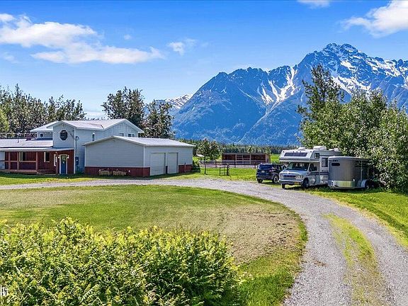 Your farmhouse with phenomenal views awaits! Totally remodeled with a private master suite on the whole top floor which also includes an office/craft room and your very own private deck to enjoy your mountain views. Tons of light flood this home to create warmth in every room from the farmer's kitchen, separate dining area, living room and master suite. This home boasts large rooms that flow from one to the other and a lower deck, perfect for entertaining. There is one arena in the front and one in the back with horse stalls. There is an additional storage and room for chickens! Hiking out your own front door and all the Palmer area has to offer. -Completed with 4 cats and 13 chickens for a great start to a minifarm. -80ft x 100ft professionally graded horse arena with geotech fabric and layered base of compacted rock, gravel, and sand for excellent drainage. -Large tack room next to arena with garage door closure and electrical box powering security cameras, arena lighting, and water heaters. -20ft x 30ft greenhouse turned hay storage by removing the front wall. Holds over 500 large square bales. -Fenced in backyard for horse grazing in summer.