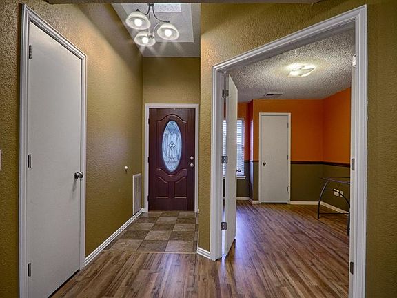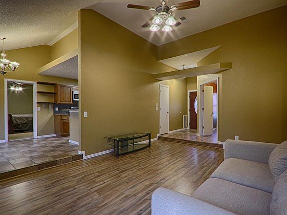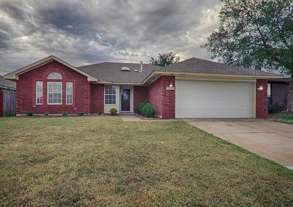 This charmer wont last long, see it today. Large open living room with wood look flooring and beautiful wood burning fireplace. Living room opens to dining area with large windows that let in great natural lighting and complete with lavish tile. Kitchen is equipped with same lavish tile and decadent granite countertops. Laundry room is secluded off the kitchen area with storage space. Don't miss the master bedroom with amazing master suite and skylight. Fourth bedroom is off living room and could be used as office. Other bedrooms are good size with comfy carpet. Quiet open back yard with lots of area for you kids and pets to run around. Storm shelter in garage.