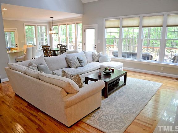 Exquisite executive home on private wooded lot nestled in quiet comm. w/close prox to Raleigh/Cary/Durham. Welcoming foyer flows to an open concept design with 1st Flr Master w/cath clgs, bright 2 story family rm w/skylights, well designed kitchen w/bar seating and b'fast area. Main floor includes mudroom & laundry w/sink, dining rm, office/study, screened porch and opens to exceptional deck space w/ awning! Master spa bath w/heated floors & spa designed shower! Firepit! Many updates! Nature lovers dream!