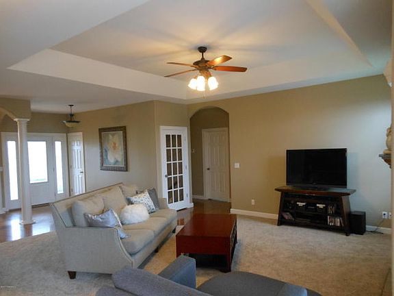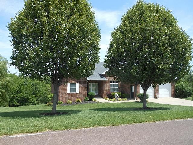 Gorgeous setting with countryside & sunset views! Great curb appeal with newer landscaping in front. Step inside to the abundance of natural lighting, open floor plan, gorgeous hardwoods, split bedroom design, specialty ceiling in numerous rooms, 9' ceilings throughout! Kitchen features breakfast bar, pantry, breakfast nook, walk out to concrete patio. Master suite is spacious and boasts huge walk in closet, jetted tub, double vanity, step in shower & linen closet. Awesome family room down along with a 4th bedroom (no closet) so makes a great office space! Abundance of storage! Concrete driveway to 3rd garage - would accommodate multiple vehicles, boat, ATV's, etc. b/c excavated under upper garage. Laundry room features sink & add'l. cabinetry. Security system. Four sides brick