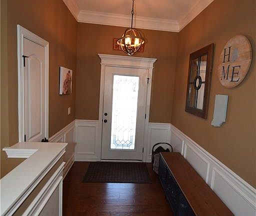 Lovely, spacious home with 4 bedrooms, 3 full baths, finished basement and three car garage in neighborhood with a clubhouse w/pool. Upgraded amenities include crown molding, wainscoting, high ceiling, granite counters, hardwood floors and modern lighting & fixures. The guys will love the 3 car attached garage and the additional garden garage in the basement, perfect for all your lawn equipment or kids toys. Plus tons of additional storage in the unfinished areas of the basement. Ladies will love the open floor plan, split bedrooms, first floor laundry room and the breakfast bar. The dining area is able to accommodate a very large table by spreading out into the living area. The kitchen is a delight to work in with its abundance of granite counters, white cabinets and high end GE Profile S/S & Black appliances that remain with this home. Sliding door leads to the deck and extended patio in back yard. The master bedroom features a trey ceiling with fan and a large walk-in closet. The master bathroom has ceramic tile flooring and shower surround with glass door, vanity with double sinks & a linen closet; separate room for toilet. Laundry room located just outside the master bedroom has cabinets and ceramic flooring. The other two bedrooms on this floor are nice sized and offer large windows for natural light. Another bedroom (#4) with full window & walk-in closet and another full bath (#3) and the family room are found in the walk-out basement. Fall in love with this home