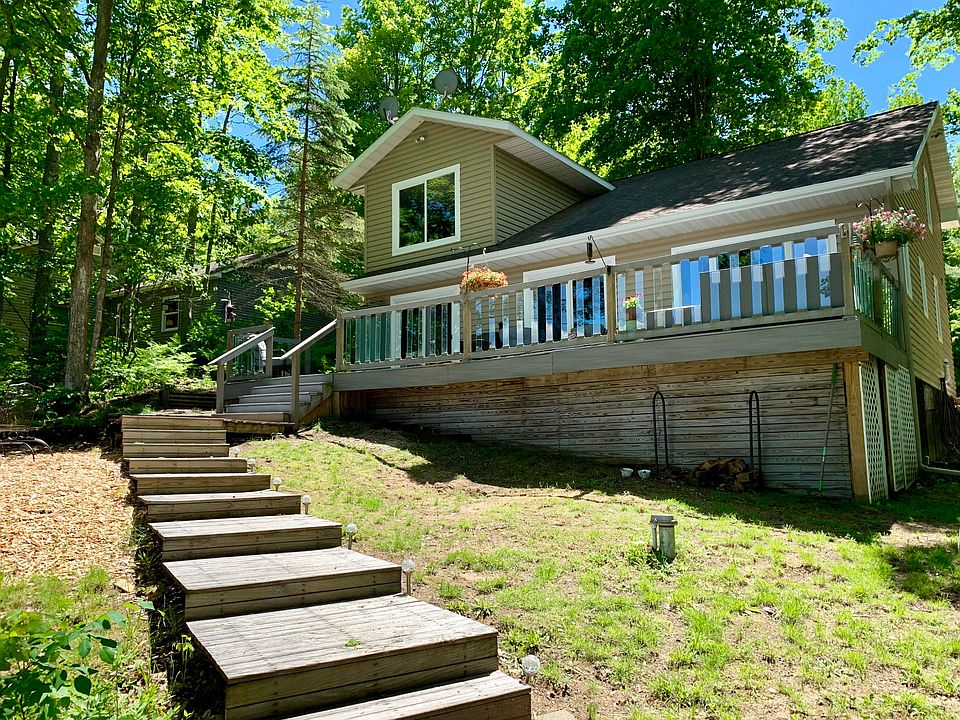 Lakefront Paradise ready to enjoy. Wonderful views of the Lake from the living areas. Large 12 x 36 composite deck with glass Balusters to view the lake. Extensive 4' wooden walk way down to Huge Bulmann dock, 70' with 12' x 10" swimming platform. 4 bedrooms, 2 full baths. Store all your toys in the 30 x 40 Pole barn garage with drive through overhead doors. Many upgrades, new glass doors to deck. Composite maintenance free deck. 4 Lots one of which is a double lot. 8 Block crawl for storage.