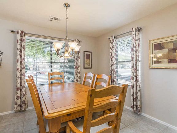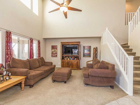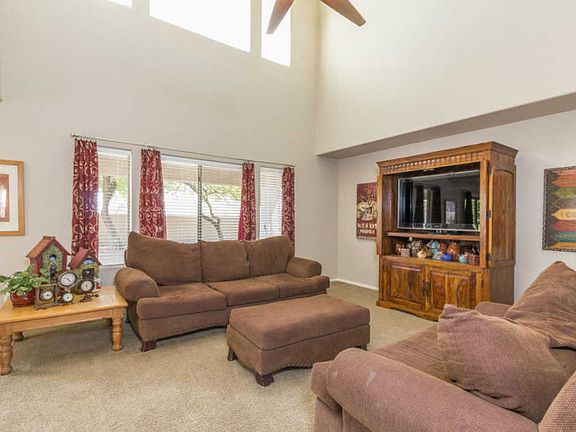 Beautiful family home with 4 bedrooms & 2.5 baths in 2097 SqFt. Great room floor plan with 2-story ceilings & a spacious eat-in kitchen with maple cabinets, granite counters, stainless appliances, walk-in pantry & breakfast bar. Refrigerator included! Sliding doors lead out to the extended covered patio and low-maintenance backyard with mature shade trees. Bedrooms are upstairs, along with the laundry room & small loft area with built-in desk. The master bedroom has a bay window & private bath w/dual sink extended vanity, separate tub & shower & walk-in closet. Other features include a 3 car tandem garage with lots of cabinetry, neutral 2-tone paint throughout, security system & leased solar providing tremendous utility savings! See this home today!