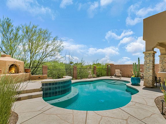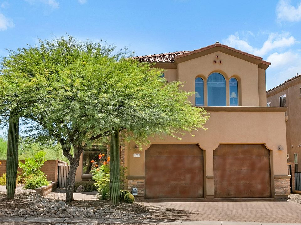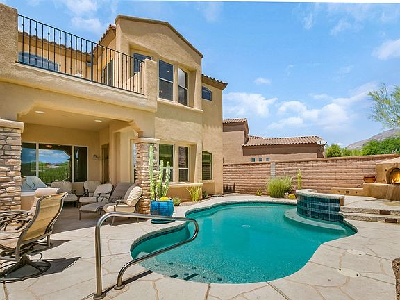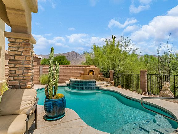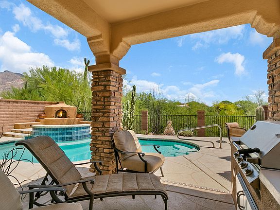 Amazing home in the heart of the foothills in a gated community! Home situated on desirable lot backing up to quiet common area of lust green desert with Views of the majestic Catalina Mountains and bright city lights! Grand foyer entry with Bright and flowing floor plan. Family Room and Kitchen open up to the sparkling pool and Fire pit with Barbeque for entertaining and fun! One bedroom downstairs and three large bedrooms with baths and sitting and play area between. The large owners suite and bath with large walk-in closets looks out to mountain and city views. Take in these views from the balcony! So many amenities you must come and see this warm and inviting home!