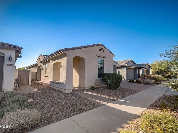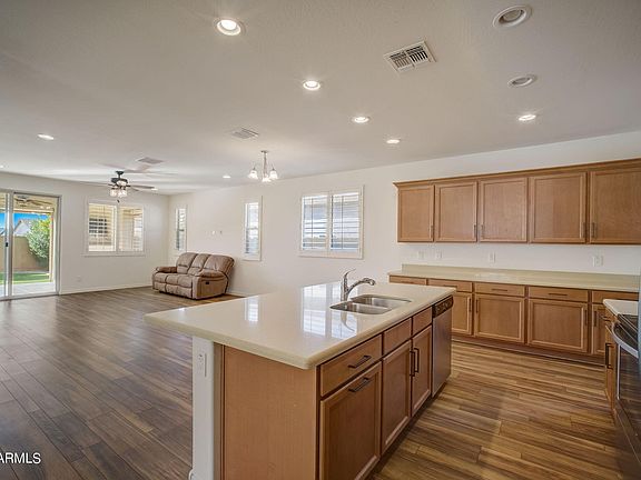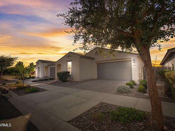 A MUST SEE! This highly sought after Waltz plan is a spacious 2 bed/2 bth +den+dining/flex room home that sits on a desirable lot & backs greenbelt. The home is nicely appointed with wood plank flooring - NO CARPET, white wide-plank shutters throughout, upgraded cabinetry, large island & SS appliances. This split plan includes an extended owner suite, W-I closet, linen closet, raised vanity with double sinks, & large W-I shower. Step into your backyard private oasis with lush synthetic grass, large covered patio, motorized patio shades, and built in exterior fire place - creating a cozy atmosphere for outdoor gatherings. Come enjoy Encore, an award winning 55+ community with pickle ball, tennis, bocci ball, clubhouse, W/O facility, billiards, pool/spa & much more!