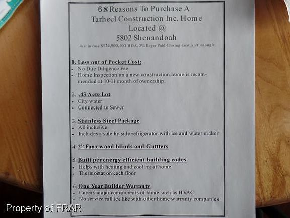 -Unbelievable New Construction for $119,900. Open concept floor plan downstairs. Kitchen with plenty of space and a pantry. Master bedroom is 15'L x 12'W. Master bath has dual sinks, walk in closet, and a linen closet. Bedroom 2 and 3 nice size with hall bath. Walk in Laundry room. Homes comes with 2" faux wood blinds, gutters and S/S appliance package with a refrigerator. Located close to Fort Bragg and less than 15 minute drive to new shops and restaurants.Plus 2% closing cost.