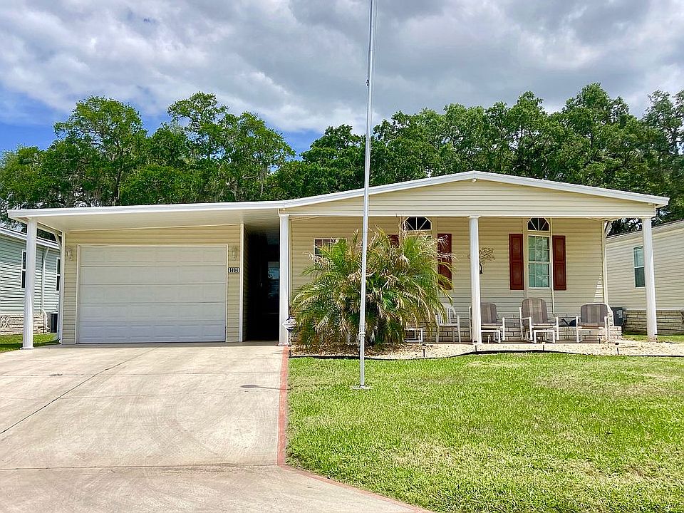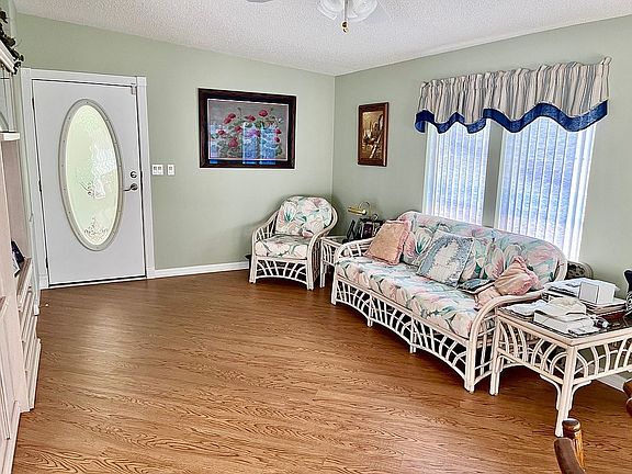 Uniquely spacious open floor plan, triple wide built in 2000, overlooking the golf course. With lovely shaded views, this well maintained home’s recent updates include new flooring & interior painting (2019-2020), hot water heater (2021), new HVAC system, ducting and UV air purification upgrade (2020) and a new roof and membrane. With 3 bedrooms and 2 bathrooms, the inviting open floor plan is perfect for entertaining. The well appointed kitchen opens to both the sizable combined living room, dining space and additional sitting/gaming area. Plenty of storage and loads of countertops, built around a kitchen island, makes the flow of the space ideal. High ceilings and the light and airy feel throughout, are complimented by a large master bedroom suite and two guest bedrooms, each with ceiling fans and built-in closets. The master bedroom features an in-suite master bathroom with double sinks, walk-in shower and built-in linen cabinets. Existing plumbing will support the addition of a master jacuzzi bath. The indoor laundry area, with washer and dryer, also serves as a convenient office space, and the guest bathroom with tub, is centrally located for ease of access. The attached garage includes dual 1 car and golf cart electric garage doors, storage shelving and a workshop area. The landscaped exterior provides a sitting area in the rear, overlooking the 5th and 6th holes of one of Betmar’s 3 golf courses, while the front sports a covered sitting area offering a space to greet the neighborhood and take in the sunset. The vestibule entry opens to a Florida Room, overlooked by the kitchen, so you can see people coming and going. Move-in ready, and sold as-is, most furnishings shown are included, along with all major appliances, and an existing security system. Located in Betmar Acres, an active 55+ community 45 mins NE of Tampa, you own your land, you do not lot rent. Low annual community fees afford a variety of recreation activities (Golf, Tennis, Shuffleboard, Swimming, Miniature Golf, Bocce, etc.), set amongst landscaped walking paths, trees, ponds, 2 pools, a dog park and 3 community buildings– hosting social events, clubs and more. Don’t miss this rare, outstanding opportunity at an exceptional home. See it for yourself.