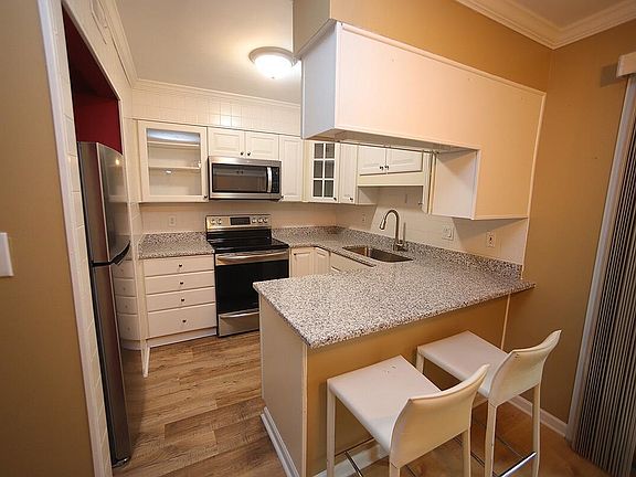 Updated kitchen with granite counters and stainless steel appliances - Renovated bathrooms with updated cabinets - Custom shower in primary bath - Laminate floors - Private balcony - Freshly painted - One assigned parking space and ample amounts of shared parking spaces - Neighborhood pool - Refrigerator, washer and dryer provided - Walk to restaurants & shopping