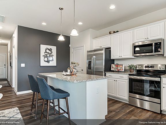The Meriwether B floorplan features a beautiful exterior with board and batten accents! An inviting foyer opens to a formal dining room. Take a few steps down the hallway and you will find a large kitchen, eat-in, and great room which is the perfect set up for entertaining. "Touch Pine" luxury vinyl flooring throughout the entire main level. The kitchen features white cabinets with crown trim, "El Dorado" granite countertops, stainless steel appliances, and pendant lights that highlight the beautiful island. Take the party outside to your beautiful 10'x12' covered porch with ceiling fan directly off of the kitchen and great room area. Upstairs you will find a large primary suite that offers double bowl vanities, white cabinets, quartz countertops, five-foot shower, huge walk-in closet, and a linen closet! Huge open loft, two large secondary bedrooms, and a full bath complete the second floor. Do not miss out on this opportunity!