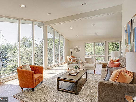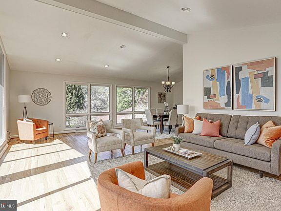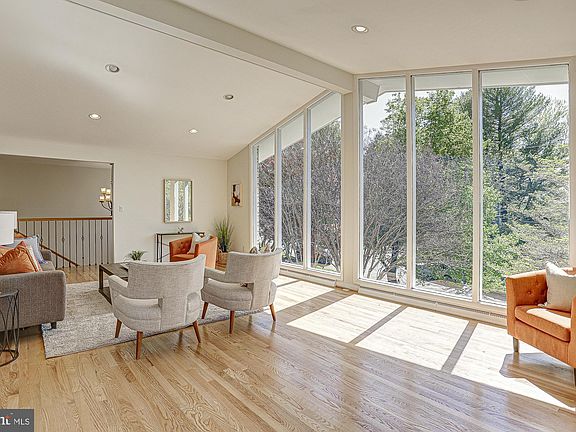 If you are looking for light and bright with lots of drama, look no further! This one is a real surprise! The drama of the vaulted space with floor to ceiling windows in the living room/dining area really is a showstopper. This house is sited on a hill and there is "a view" from all the the living areas. A perfect house for large scale entertaining, you can easily expand the dining area. The modern kitchen opens to a table space area and a family room addition with a cathedral ceiling and glass across the back of the house. The family room opens on a large deck with stairs down to the fenced yard. The skylit primary bedroom has ample closets, another vaulted ceiling and an ensuite bath. Two other bedrooms and a hall bath complete this level. The lower level has a second family room, a fourth bedroom, a full bath and a big bonus/playroom area and a two car garage. There is lots of flexible space in this home. Fresh paint and refinished floors make this one shine. The fenced rear yard has lots of space and the garage really has room for two cars and also tons of storage. Close to downtown Bethesda and in the Whitman School cluster.