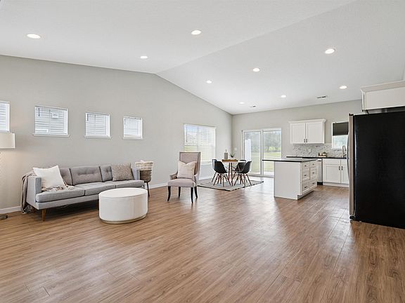 Welcome home! This well-designed, zero entry, three bedroom, two bathroom home is sure to impress! Stepping inside, you will love the open floor plan with volume ceilings. The living room is spacious and flows seamlessly into the kitchen and dining area. With solid surface tops, soft close drawers, stainless appliances, custom cabinetry and a tiled backsplash, you will love this one. The center island and breakfast bar offer convenient living. With access to the rear patio, this dining space is perfect for entertaining. The primary bedroom and private ensuite are great, featuring a walk-in closet and solid surface tops. With two additional bedrooms and an additional full bathroom, this one is so great to come home to. The laundry space and drop zone area off the garage make living easy! You will appreciate the exterior spaces including a two stall garage, nice landscaping, a private rear patio with views of the pond behind and more. Schedule your showing today! This one will go fast!