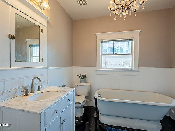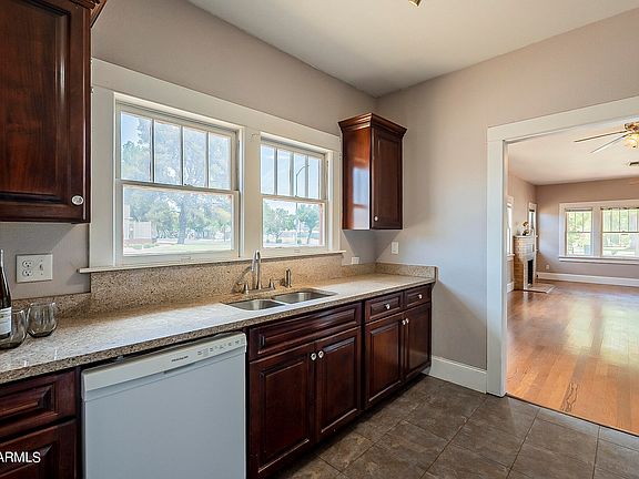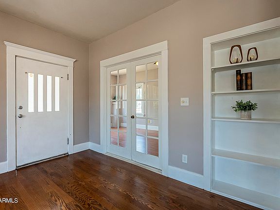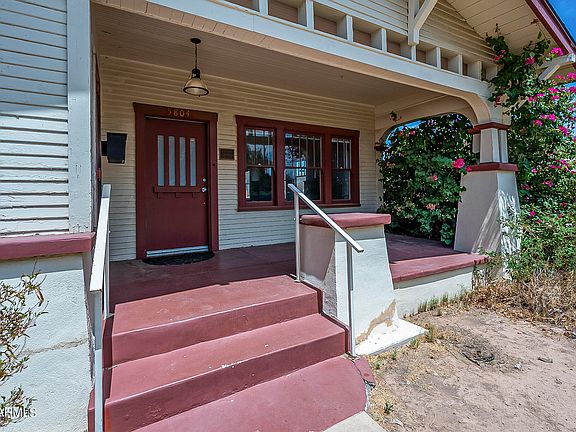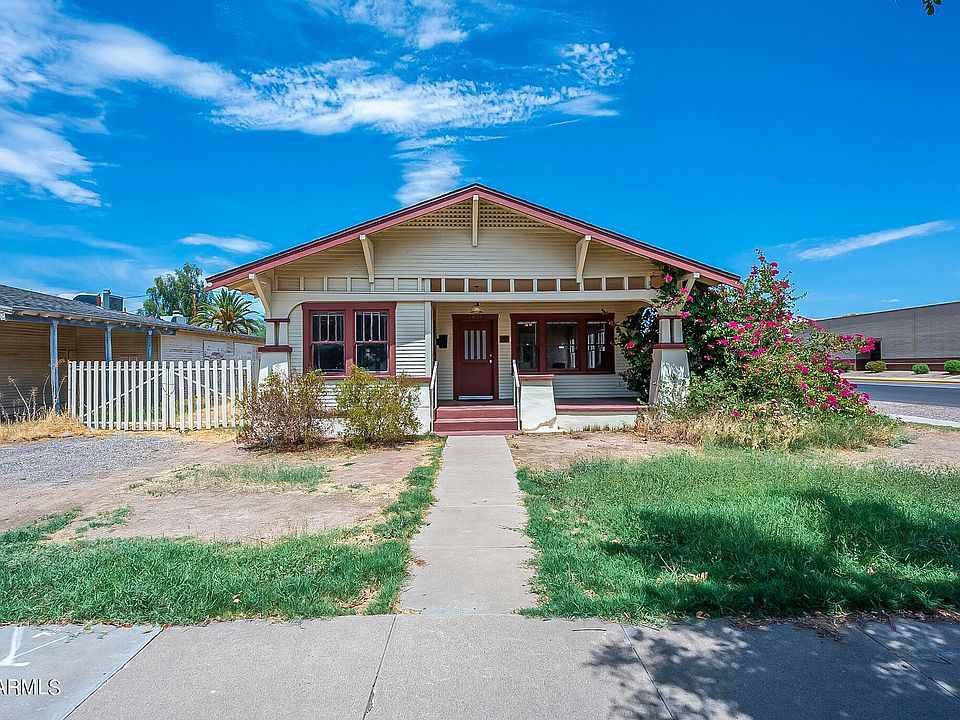 Beautifully restored 3 bed 2 ba Craftsman-style property is located in the heart of Glendale's historic Catlin Court. Recognized in the National Historic Register, this house was built & occupied by F.M. Stagg, one of Glendale's early builders. Open living space with bright natural light from large picture windows, cozy fireplace, and charming built-ins. Kitchen w/ custom cabinets + granite counters, undermount sink, and GAS range. Main bath w/ updated finishes + original details, cast iron tub, and chandelier. Master bedroom w/ en suite bath & exit to backyard. Detached 447 sq ft guest house w/ full bath & AC. PAD commercial/ residential zoning, perfect for running a home business. Close to schools and just a short drive to Westgate Entertainment District & State Farm Stadium.