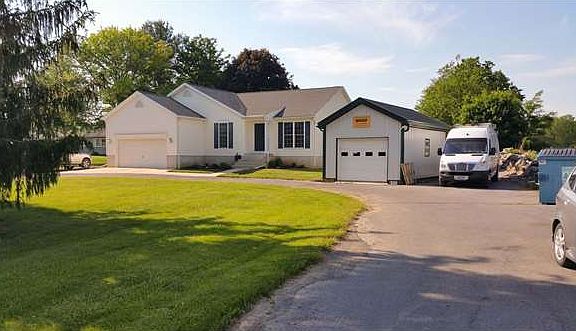 Rancher on 2 acres Sprawling on 2 acre lot, this newer rancher w/attached garage, & detached garage w/new metal, heat pump, efficient hot water heater, concrete basement walls, circular driveway, mature trees, partially fenced pasture area, rough in for additional bath in basement all adds up to a deal you don't want to miss!