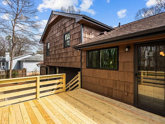 This modern style cabin home, offers the perfect blend of comfort and convenience. Offering 4 beds, 2.5 bath, only 15 minutes to downtown Raleigh, walking distance to Millbrook Highschool, 5-10 minutes to Lafayette Village, and 5 minutes to Ravenscroft. This is a very unique home with a lot of upgrades. It features a lofted 16ft ceiling, quartz counter-tops, raw maple counter tops, 6ft serving window in the kitchen for indoor outdoor use, new porch, partially wooded backyard for privacy, sod and landscape . Almost every inch of this home has been touched! If you love the mountains and cabins, come take a look!