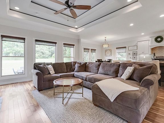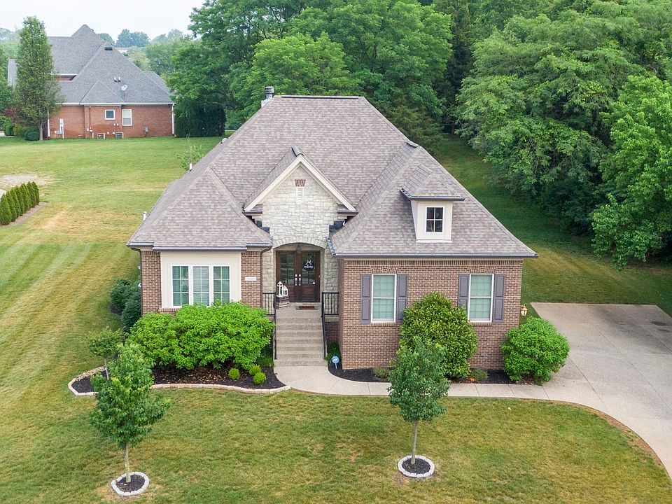 This gorgeous, open, and inviting ranch is nestled on a picturesque lot in Pine Valley Estates and is searching for its new owner. Could it be you? What will be your favorite feature of this property with so many amazing attributes? You decide! The beautiful brick and stone accents adorn the exterior of the property, while the window paned double front doors welcome you in. Inside you will find detailed trim, high-end lighting, and stunning hardwood floors throughout the main living areas. Those features coupled with the open floor plan and designer colors will make you feel like you are watching an HGTV show. So naturally, the perfect party must start here. The great room and dining room are open and make a natural space for entertaining. The kitchen is truly a chef's dream with plenty of space to spread out and create some delicious dishes. Granite countertops, beautiful tiled backsplash, a gas stove top and even a beverage center compliment this kitchen. Do not miss the enormous walk-in pantry located off of the laundry room. The causal breakfast nook overlooks the backyard and leads to the large covered patio... where the party can continue with the best summer bar-b-ques. Play cornhole next to the woods or set up the volleyball net next to the huge open lot next door. After a long day, retreat to the master suite, where you will discover a walk-in closet that even a fashionista would love. The master bath has a double vanity, large custom shower and soaking tub. The 2 other bedrooms on the main floor are located off of a hallway that separates them from the rest of the house. The bedrooms are both large and share the full bathroom. Take the party to the finished basement for movie-night or a game night while the younger guests entertain themselves in the play area. And, if your company is from out of town, treat them like royalty with this fantastic guest area. The large bedroom has 2 closets and a full bathroom right outside the doorway. There is even an area for a home gym to get your workout in! So now we want to know... what is your favorite feature? Schedule a showing so you can decide and cast your vote!