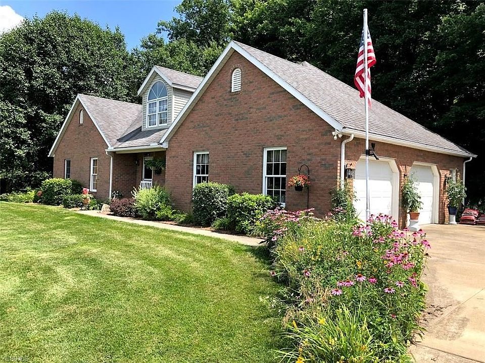 Nice custom-built one owner brick contemporary home in the fantastic Ridgewood school district situated on 2.1 acres. 1,975 sq. ft. built in 1996 with 3 bedrooms and 2 ½ baths. Open kitchen and family room. Kitchen features center island and Corian countertops, range, refrigerator, microwave, and dishwasher. Family room with brick, gas log fireplace and access to florida room with two side patios and seclusion overlooking the 2 acre setting. 1st floor Master bedroom with laminate flooring and walk in closet. Master bath includes whirlpool tub, tile floors and newer countertops. 1st floor office and laundry room. 1st floor has been freshly painted in July 2019. Hardwood floors in the foyer. Handicapped accessible doorways on the first floor. Norco windows and 6 panel wood doors throughout the home. 2 bedrooms and bath two skylights and dormers for extra lighting. Carpet upstairs landing less than 2 years old. Lower level has 10" poured walls, semi -finished rec room, and 13 course basement. Located a dead end cul-de-sac in the Porchers allotment development. All nice houses surrounding. Attached 2 ½ car garage plus detached 16' x 24' built in 2011. Ideal for extra car or boat. 320' feet of concrete driveway. Utility averages: Propane heat $84. AEP Electric $120. No mineral rights with the property. Only 25 mins from New Philadelphia. Well maintained. Country living on the edge of town. Additional lot for sale for $29,900, but home must sell first.