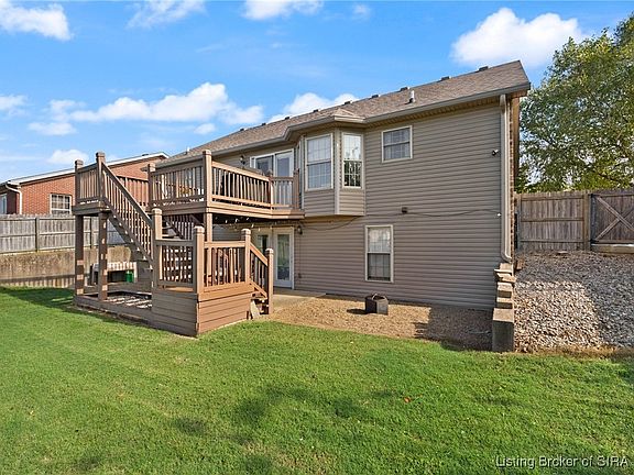 Step into this charming well-maintained home located in desirable Windy Pines neighborhood. This 3-bedroom, 2-bathroom property offers the perfect blend of comfort and style. The spacious, open concept living area with vaulted ceilings is perfect for entertaining, featuring plenty of natural light. The eat in kitchen offers ample cabinet storage with a bay window overlooking the large fenced in backyard. The primary bedroom offers a peaceful retreat with a private ensuite bathroom and a walk-in closet. Basement is plumbed for 3rd bathroom. New HVAC replaced in 2023. The partially finished walkout basement offers additional living space, game room opportunity, and extra storage space. Outside, you will find a lovely deck overlooking the large, fully fenced backyard providing the ideal space for relaxing or entertaining guests. The home is conveniently located by Hwy 62, prime location close to local shopping, dining, east end bridge, and schools. Inspections are welcome but home is being sold as is. $500 allowance at closing for new dishwasher.