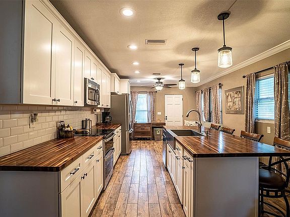 PENDING! 5806 TENNESSEE AVENUE Downtown New Port Richey, FL $235,000 Adorable bungalow home located walking distance (3 full blocks) or take your golf cart to downtown New Port Richey. Everything in this home has been completely remodeled, including new crown molding and baseboards, new roof, new porcelain tile floors, new air handler, entire new bathroom, beautiful high-end Hunter ceiling fans in almost every room, and completely new kitchen in 2020. Beautiful new butcher block countertops (super easy to maintain), Jarlin kitchen cabinets (Property Brothers uses these cabinets on almost every show – Jarlin engraved in the drawers) with pantry cabinets built around your fridge to slide into perfect, 8' island with large farmhouse sink in center, can lighting and pendant lights. Owner took original pine ceiling boards that were used in 1958 to build this home and used them to make the half walls in the bathroom to keep something original from the home from 1958. New Anderson storm doors on front and back – you can drop the top glass to have screen doors for awesome cross breeze in the fall). Copper sink ($250) and copper mirror ($500) in bathroom. New faux wood blinds in every room. Much care and consideration was put into this home to make it absolutely beautiful! Oversized lot (7348 square feet) with alley access. There is also a lot for sale next door that you can combine the 2 lots to make 1/3 of an acre and take the whole corner - giving you much potential to make this the perfect oasis. Make your move - priced to sell fast - $235,000. Commission to buyer's agent is 2%.