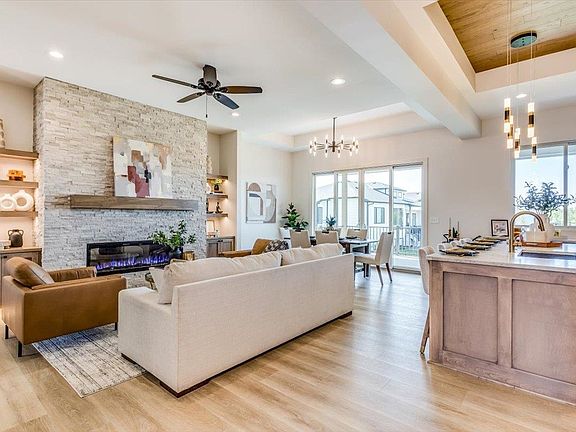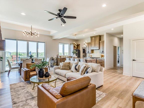 This is an exceptional custom-built home with fantastic features and upgrades, 4-car garage with additional overhead door at rear, located on the lake, and is located in the much desired Edgewater Community! The brand new “Kimi” Plan has a tray topped foyer entry that flows to the open living, dining, and kitchen area with beautiful LTV flooring and cafe kitchen appliances. The living room is warm and inviting with an electric LED smart fireplace. The kitchen showcases custom cabinets with under counter lighting, large quartz topped island and perimeters, and large walk-in pantry with quartz countertops. The tray ceiling topped dining area will fit your longest tables, and opens to the 26’ x 10’ covered composite deck looking out to the lake. The primary bedroom is spacious and comfortable with a trayed ceiling and pocket door to the bathroom, which features tile heated floor, quartz countertops, and frameless glass doored tile shower with linear niche and bench. The main floor also includes two additional bedrooms, bath, plus an office! Dramatic accent wall in the staircase accompanies your journey down to the finished basement with 9’ ceilings (a rare find), larger windows for tons of light, large family/rec room with wet bar and 2nd LED smart fireplace, bathroom, and 2 more bedrooms, one of which is connected to storage with a hidden door. Additional home features include Class 4 composition shingles on roof, large concrete patio, upgraded house insulation, insulated garage doors, finished drywall and wall insulation in the garage, upgraded HVAC to 96% 2 stage heat, 18 SEER 2 stage AC, tankless hot water heater, additional laundry hook ups in basement, toe kick lighting, and lighting on beams and shelving. Yard is completely finished with well, sprinkler, sod, and landscaping. Enjoy the amazing features of this brand new home and the beautiful sunsets from the covered patio and deck. Edgewater is almost sold out, so this is your chance to live in one of the most sought after areas in the Maize schools! Information deemed reliable but not guaranteed and may change without notice. Room sizes estimated. Taxes are shown on vacant lot only. Specials may not be entirely spread on this lot. There is a $250 mailbox fee collected at closing. Seller is licensed real estate agent in Kansas.