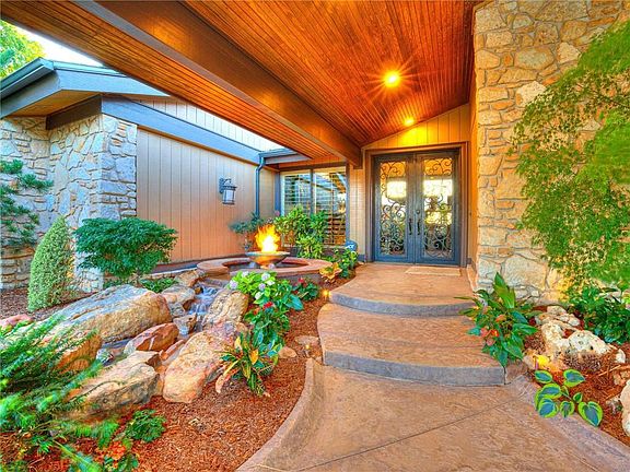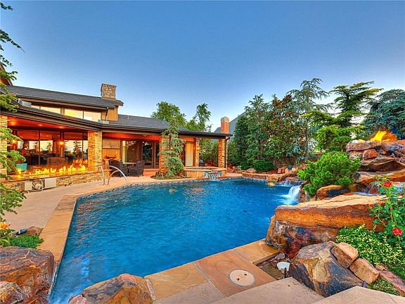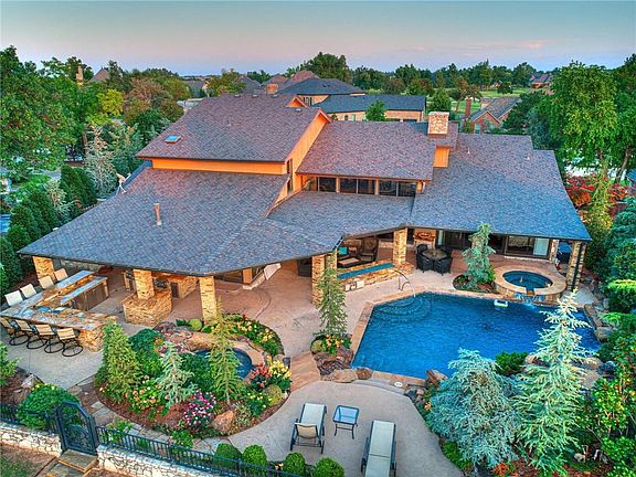 The distinct Oak Tree Neighborhood, known for its PGA Championship golf course, is the setting for one of Edmond's most refined residences. This exceptional estate listing brings a design continuum without compromise, where finish qualities deliver the completeness and authenticity that great architecture provides. Arrive and walk through the lush courtyard entry to the welcoming home. Upon entering framed views of the outstanding pool and astounding landscape prevail. Large open spaces inside make entertaining a breeze inside or out. The private master suite features his and hers bathrooms and spacious closets. Privacy abounds upstairs with all bedrooms being ensuite with walk in closets. Lush landscape, a well thought out out kitchen with bar seating, linear fire pit and exquisite pool with 4 fire bowls, 7 waterfalls, 2 streams, kids swim area and hot tub provides a one of a kind tropical escape. Feels like Palm Springs in Edmond! This one needs to be seen in person!