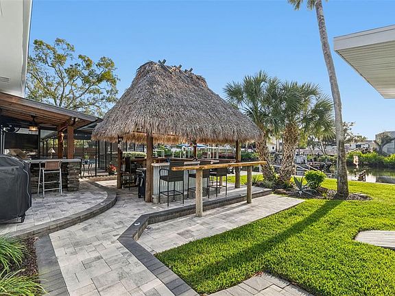 Riverfront living at its finest in the heart of downtown New Port Richey. Welcome to 5809 Rio Drive, a fully renovated, double lot waterfront estate offering exceptional indoor, outdoor living, modern upgrades throughout, and one of the most impressive backyards on the river. This meticulously updated home features a pavered double driveway, refreshed exterior, and all major mechanicals updated including roofs and HVAC systems. Inside, you’ll find tile flooring throughout, plantation shutters, double-pane windows, modern trim, fresh paint, and solar tubes that flood the home with natural light. The open family room flows seamlessly into the chef’s kitchen, complete with quartz countertops, all wood cabinetry, brand new appliances, oversized island seating, and a custom coffee bar perfect for entertaining. The primary suite offers a spacious retreat with double closets, slider access to the backyard, custom built ins, and a beautifully remodeled bathroom featuring frameless glass, modern brass finishes, and a rain shower. Two additional bedrooms and a fully updated bathroom are located upstairs, all finished with matching tile and thoughtful details. A standout feature of this property is the private in law suite, functioning as a second primary bedroom with its own entrance, full kitchen, built-in closets, solar tube, and remodeled bathroom ideal for multi generational living or long term guests. Additional living spaces include a flexible multipurpose room with sliders on both sides and a charming tiled patio overlooking the river. A renovated pool bath with full shower and outdoor access adds convenience for entertaining. Step outside to a resort style backyard designed for unforgettable waterfront living. Enjoy a heated, recently refinished pool, expansive pavers, refreshed pool cage, outdoor living room with TV, and an incredible tiki bar featuring double TVs, refrigeration, built in grill, and covered seating. The fully fenced double lot provides exceptional width and privacy, complete with irrigation, matching storage shed, fire pit area, and Adirondack seating. On the water, you’ll find a floating dock, 10,000lb boat lift, and a recently redone seawall perfect for boating, sunset cruises, and enjoying the river lifestyle. This property delivers a rare combination of turnkey condition, flexible living spaces, and unmatched outdoor amenities. A truly complete riverfront home designed for comfort, entertaining, and making memories. (Roof-2021)(A/C-2018)(W/H-2017)(Seawall-2018) (Boatlift-2020) (Floating Dock-2021)