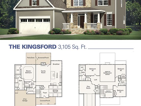 Kingsford-2 story foyer w/ elegant dining room.The kitchen has tons of space! Enjoy the large island perfect for after school snacks!The 2story family rm offers a fireplace & opens up into your breakfast nook. Downstairs also features your owners suite w/ double vanity & walk in closet!1st floor has laundry rm & drop zone perfect for coats & shoes!The 2nd floor features 3 spacious bedrms, 2 full baths & huge bonus room great for a man cave or play room!
